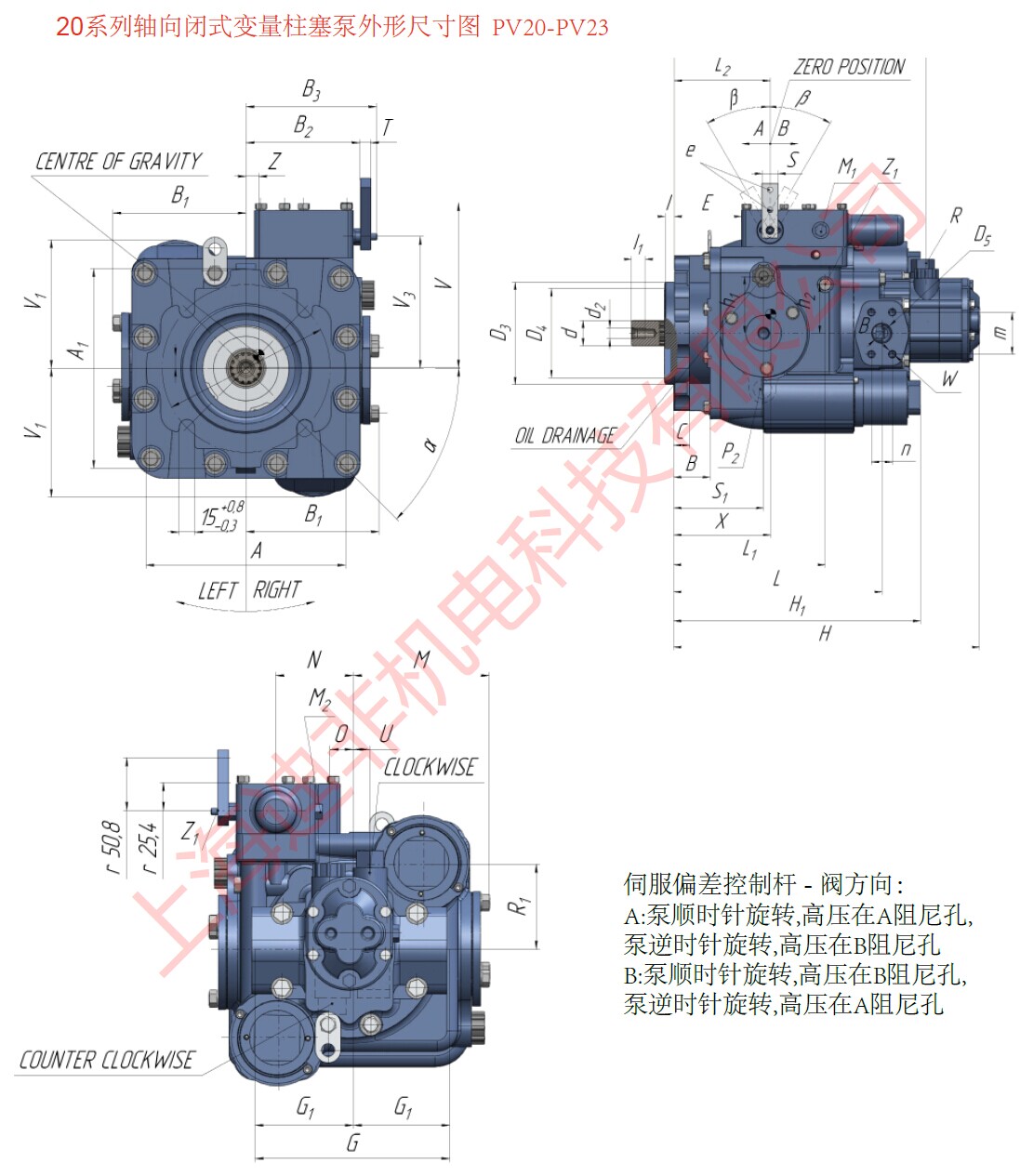 PV20系列軸向變量柱塞泵,采用斜盤結構,適用于閉式回路靜液傳動。流量正比于泵驅動速度,反過來,改變旋轉斜盤的角度,可實現泵在零和最大排量之間無級調節。可調節控制手柄相對于0位的位置(左側或右側),來改變流體的方向,從而達到換向的目的。 液壓 - 機械伺服排量控制裝置保持或調節斜盤位置,因此泵排量控制手柄后的釋放,旋轉斜盤自動返回到零位位置和流量變為零。